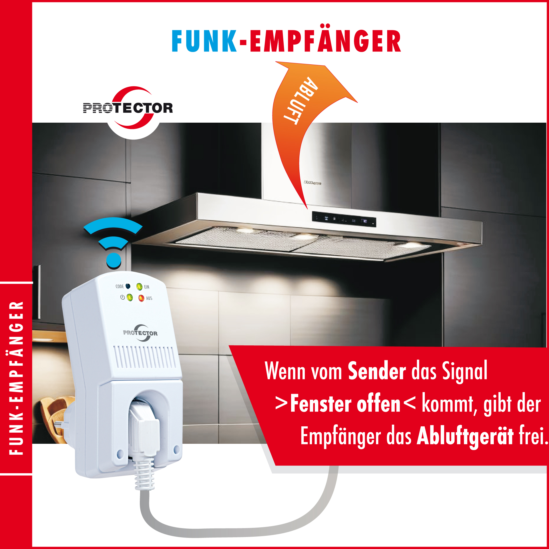 Das Abluftgerät (Dunstabzugshaube, Abluftventilator etc.) wird vom Fensterkontakt freigegeben, wenn das Fenster geöffnet wird.